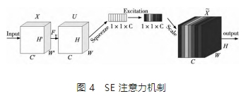 本文通過引入 SE 注意力機制模塊,以建立卷積特征通道之間的相互依賴性來提高網絡的表示能力。首先,輸入特征圖 X,讓其經過 Ftr操作生成特征圖 U; 然后,進行 Squeeze 操作、Excitation 操作,Scale 操作。Squeeze 操作是一種壓縮操作,它將輸入圖像 的高度 H 和寬度 W 都壓縮為 1,但通道數不變的矩陣。通常使用全局平均“池化”操作來實現,以確保最終特征包含輸入圖像的所有信息。Excitation 操作對通過 Squeeze 操作生成的 1 × 1 × C 特征圖進行維度降低和恢復操作,使用全連接層獲取不同通道的權重,自動關注具有最高權重的通道。Scale 操作是一種簡單的加權運算操作,它將 Excitation 操作生成的特征圖與輸入特征圖通過 Sigmoid 激活函數進行 Channel 運算,得到輸出值。