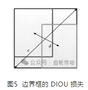 如圖 5 所示,c 是覆蓋兩個錨框的最小封閉框的對角線長度,d = ρ 2 ( b,bgt ) 是兩個錨框的中心點的距離。其中 b 和 bgt分別表示和的中心點,ρ 為歐氏距離,c 為覆蓋兩個框的最小包圍框的對角線長度。DIOU 損失函數可以定義為: