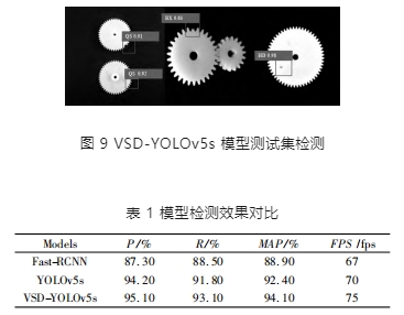 如圖 9 所示,為了對 VSD-YOLOv5s 模型的檢測性能進行全面評估,本文采用 YOLOv5s 和 VSD-YOLOv5s 作為縱向比較模型、采用經典的目標檢測模型 Fast- RCNN 作為橫向比較模型,設置相同的實驗參數,上述模型的檢測效果表 1 所示。