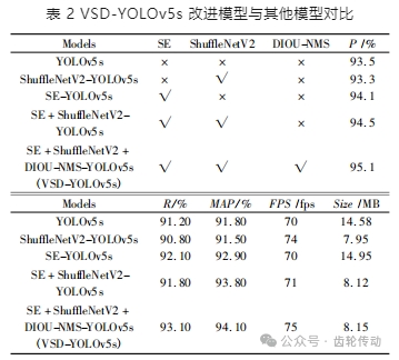 為了驗證不同改進方法對 YOLOv5s 模型性能的影響,本文對多種改進方法進行了比較與討論,如表 2 所示。“√”表明網絡模型中加入此模塊,而“× ”表明網絡模型中沒有加入此模塊。原 YOLOv5s 模型的大小是 14.58 MB,FPS 為 70 fps。使用 ShuffleNetV2 模塊的輕量級 ShuffleNetV2-YOLOv5s 模型的大小減少到 7. 95 MB,FPS 提升到74 fps。結果表明,當在模型中加入 ShuffleNetV2 時,可達到模型輕量化的效果并提升識別速度; 單獨使用 SE 模塊時,YOLOv5s 模型的 MAP 從 91.2% 增加到 92.1% 。ShuffleNetV2-YOLOv5s 模型的 MAP 從 91.80% 增加到93.8% 。當SE 注意力機制、DIOU-NMS 以及 ShuffleNetV2 同時應用時,相比于原模型,VSD-YOLOv5s 模型的識別準確率提升了 0. 9% ,識別精度提升了 1.7% ,識別速度提升了 5 fps, 模型的性能得到了全面改善,達到最優。