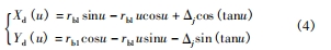 建立坐標系 XdOYd,如圖 1 所示,以 Δx 作為增量等距離散嚙合線,并在圓周方向上計算出輪齒 1 上的齒廓對應點,若該點位于修形齒廓區域內,嚙合線離散點的齒廓對應點處的修形量 Δj 為: