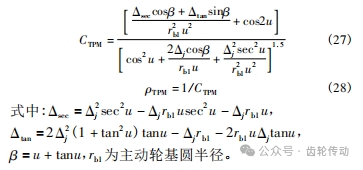 首先,需確定不同齒廓赫茲接觸類型下接觸點處的綜合曲率半徑 Re,針對未修形的齒廓區域,根據歐拉薩瓦利公式,通過計算沿嚙合線方向上基圓至嚙合點的距離求得其曲率半徑 ρ1、ρ2,對于齒廓修形區域,以主動輪為例,根據微分幾何與修形齒廓方程式 (4) ,可推導出修形齒廓曲率 CTPM與曲率半徑 ρTPM。