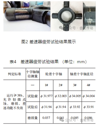 試驗結論:輪間差速器、軸間差速器符合設計要求。差速器十字軸與行星齒輪出現一定磨損但未失效或膠合,故障初步得到復現,但沒有市場反饋損壞得嚴重。