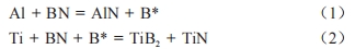 圖 2 為不同合成壓力下 PCBN 材料 XRD 圖,由 XRD 圖譜可知經高溫高壓合成后的 PCBN 材料的物相由 TiN,AlN,BN 和 TiB2構成,原料中加入 Al、Ti 并沒有檢測出來,說明其已經完全反應,轉變成了 TiN,AlN和TiB2的結合相。推測燒結過程中發生的反應過程如下: