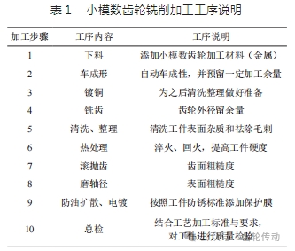 在銑齒機上,小模數齒輪用輪廓與齒輪齒槽形狀完全一致的齒輪銑刀沿工件軸向進給。每銑一個齒槽,工件進行一次分度,即轉過一個齒,依次銑削出全部齒槽。不論是漸開線齒輪還是修正擺線齒輪,原理相同。對于不同的銑削加工工序有不同的工藝要求,如表 1 所示。