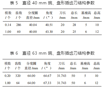 小模數齒輪插齒加工是利用插齒刀具與工件齒輪之間的嚙合運動,使刀具形成往復的運動狀態,并且圍繞自身軸線進行運動,進而在運動中切削出工件的齒形。插齒運動還包含圓周、徑向、分度、讓刀 4 種,因此小模數齒輪插齒可以加工部分具有較高要求的齒輪,如雙聯齒輪、內齒輪等。此外,小模數齒輪插齒加工對于刀具的精度要求較高。例如,公稱分度圓直徑為 40 mm 和 63 mm 兩種碗、盤形插齒刀結構參數,如表 5 和表 6 所示。
