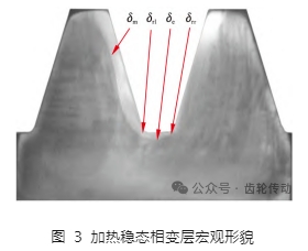 在此工藝參數(shù)下,掃描至齒寬中部加熱穩(wěn)定狀態(tài)的相變層宏觀形貌如圖 3 所示,以感應(yīng)器完全駛?cè)臊X輪開始計算,所截取齒輪截面位置為距離駛?cè)攵嗣?100 mm 處.其中,δm ,δrl,δe,δrr分別表示側(cè)向齒廓、左側(cè)齒根圓角、齒根中部,以及右側(cè)齒根圓角處的最小相變層深度.