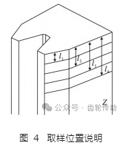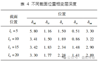 將模數(shù)為 16 的齒輪側(cè)向齒廓最小相變層深度 δm 繼續(xù)細(xì)化為左側(cè)最小相變層深度 δml,以及右側(cè)最小相變層深度 δmr。l1 至 l4 截面位置,其各處的相變層深度數(shù)值如表 4 所示.左側(cè)齒廓相變層深度在 l1 = 5 mm 時較大,達(dá)到了 δml = 5. 80 mm.其余位置穩(wěn)定在 3. 40 mm 附近,變化率 為 43. 1% .同樣,右側(cè)齒廓的相變層深度 δmr 由 3. 30 mm 逐漸降低至 2. 90 mm.而齒根處以及兩側(cè)齒根圓角位置,相變層深度則不斷增加.δrl 由 1. 16 mm 增加至 1. 83 mm,δe 由 1. 50 mm 增加至 2. 30 mm 附近,δrr由 0. 51 mm 增加至 1. 48 mm 附近.然而,在此參數(shù)進(jìn)行模數(shù) 16 齒輪的感應(yīng)處理時,齒根及圓角位置硬化層與加熱結(jié)果不完全匹配,原因在于感應(yīng)器冷卻結(jié)構(gòu)導(dǎo)致齒輪對應(yīng)位置的冷卻不足.