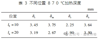 對于遠(yuǎn)離齒輪端面的 l2 = 10 mm 截面和 l4 = 20 mm 截面,不同位置的加熱深度如表 3 所示.其中,δt,δm,δr,δe 分別表示齒頂、齒側(cè)、齒根圓角以及齒根的加熱深度.在不同截面中,齒根圓角處均為深度最小位置.在加熱達(dá)到運(yùn)動穩(wěn)態(tài)之前,隨著遠(yuǎn)離齒輪端面,加熱深度逐漸降低.齒根圓角處不但是強(qiáng)化的薄弱區(qū)域,同時還是加熱的薄弱區(qū).
