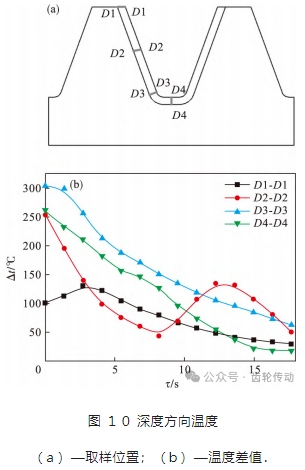 在加熱深度方向,生熱情況將反向影響加熱結(jié)果,齒輪內(nèi)部對應(yīng)位置與表面溫度的差值是最直接的體現(xiàn).圖 10 為深度方向溫度圖,如圖 10a 所示分別在齒頂、齒中、齒根以及齒底位置取分析節(jié)點(diǎn),計算表面與內(nèi)部溫度差,取樣深度為 3 mm.D1 - D1、D2 - D2、D3 - D3 及 D4 - D4 位置的溫度差值隨時間變化如圖 10b 所示.其中,起始時間為截面出現(xiàn) 870 ℃高溫區(qū)域時。