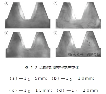 不同截面位置的相變層變化如圖 12 所示.在各個截面位置,齒根圓角處的相變層深度均為最低.在靠近齒輪端部位置的 l1 = 5 mm 截面層,齒側(cè)中部相變層深度變化平緩,這與加熱結(jié)果及冷卻過程相契合.而隨著遠(yuǎn)離端面,相變層發(fā)生較快改變,中部位置相變層深度發(fā)生顯著收縮.至 l4 = 20 mm 截面時,相變層達(dá)到穩(wěn)定狀態(tài).而齒根及圓角處,隨著遠(yuǎn)離端面,由于設(shè)備運(yùn)行偏差導(dǎo)致的影響降低.