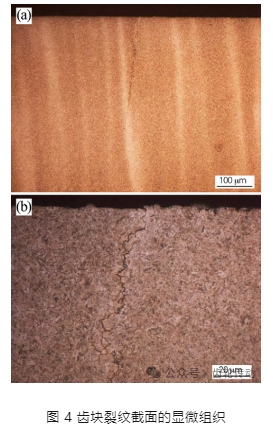 在裂紋附近選取齒塊截面試樣進行金相檢查。圖 4 是裂紋截面顯微組織,裂紋呈沿晶擴展,尾端尖細,未見分叉,具有淬火裂紋特征。
