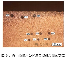 通過淬火硬度也可以反推出表面含碳量,從圖 6 可以看出,未脫碳的淬火硬度為 557 HV0.3,表面脫碳層硬度僅為 312 HV0.3。根據表 1 可知,557 HV0.3 對應的含碳量為 0.41% 。根據碳含量和硬度的關系可知,312 HV0.3 對應的含碳量為 0.06%。結合含碳量對相變轉變溫度 Ms 的影響可知,脫碳層會極大加劇感應淬火開裂。需要指出的是,感應淬火過程中并不會形成脫碳,因此該脫碳層應在感應淬火之前已經存在。通常,齒頂的半脫碳層會通過機加工去除,但當調質畸變過大,調質后局部齒頂加工量不夠,就會在齒頂處殘存半脫碳層。
