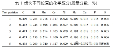 為了進一步檢測內齒圈的成分偏析情況,對感應淬火開裂齒塊進行不同區域的直讀光譜測試( 距離表面 5 mm 開始測量,間隔 10 ~ 15 mm 交替測量) ,測試位置的示意圖如圖 3(a) 所示。表 1 為齒塊不同位置的化學成分情況。由表 1 可知,齒塊的化學成分偏析主要是碳元素,齒頂位置碳含量偏低,隨著往齒心部移動,碳含量不斷增加。