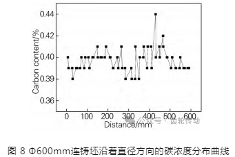 風電內齒圈的鋼牌號為 42CrMo4,且采用連鑄工藝制造成圓坯進行齒坯成形。由于 42CrMo4 鋼的碳含量在 0.38% ~ 0.45% ,在大截面連鑄過程中容易形成嚴重的偏析。在直徑 Φ600 mm 的 42CrMo4 鋼大圓坯,沿著直徑方向進行成分檢驗。圖 8 為 Φ600 mm 連鑄坯沿著直徑方向的碳濃度分布。由圖 8 可知,大連鑄坯的碳偏差值達到了 0.06% 。