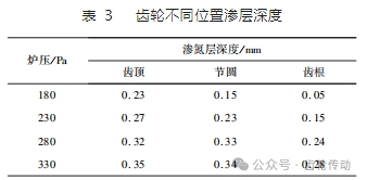 保持向離子滲氮爐內通入的氨氣量不變,向爐內通入氬氣,致使爐內壓強增加,輝光厚度變薄,在更小的空間內能進行正常滲氮,所以從齒頂到齒根滲氮層深度差逐漸減小。本文中當爐壓為 230 Pa 時,模數為 4 mm 的小齒輪試樣齒根部滲層深度已是節圓處的 65% 左右;當爐壓升高到 280 Pa 時,齒根部滲層深度升至節圓處的 73% 左右;當爐壓升高到 330 Pa 時,齒根部滲層深度升至節圓處的 82% 左右。