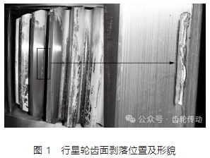 該行星輪齒面剝落情況如圖 1 所示。在行星輪其中 1 個齒面上,靠近齒根位置存在一處長度約 60 mm、寬度約 3~8 mm、深度約 2 mm 的剝落坑,該剝落坑沿齒寬和磨削方向進行擴展。另外現場檢測發現,該行星輪其他輪齒工作面上加工刀痕清晰可見,未見明顯異常,且經著色探傷,未發現裂紋等缺陷。