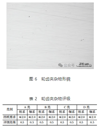 在行星輪齒面剝落位置和正常位置切取金相試樣,磨制拋光后,依據 GB/ T 10561—2005《鋼中非金屬夾雜物含量的測定標準評級圖顯微檢測法》對其非金屬夾雜物進行檢測評級。非金屬夾雜物形貌如圖 6 所示,評級結果如表 2 所列,符合該行星輪圖紙技術要求。