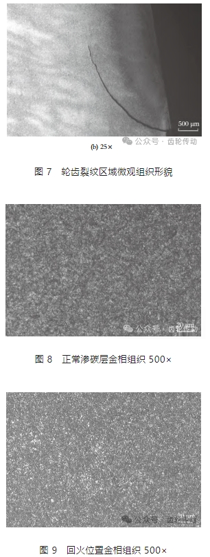 經 4% 硝酸酒精溶液腐蝕后觀察,齒面含裂紋區域的表層組織異常,顏色顯示較深,裂紋走向與顏色異常區域形狀相關聯,如圖 7 所示。顏色正常位置的金相組織主要為隱針回火馬氏體,如圖 8 所示,顯微硬度為 710HV1;顏色異常位置的金相組織主要為回火屈氏體,如圖 9 所示,顯微硬度值為 540HV1,表明齒面上該區域發生了磨削回火燒傷現象。
