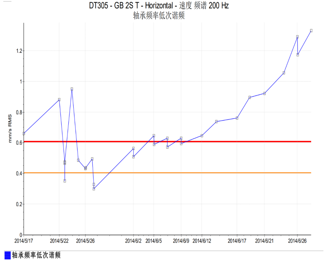 由于生產(chǎn)不允許停機(jī),對齒輪箱進(jìn)行監(jiān)控運(yùn)行,通過振動(dòng)趨勢的監(jiān)測發(fā)現(xiàn),GB 2S T 和 GB 3S T 軸承測點(diǎn)振動(dòng)值在不斷抬升(見圖 5 和圖 6),說明軸承狀態(tài)在不斷惡化,在做好檢修的充分準(zhǔn)備工作后于 2014 年 6 月 28 日按計(jì)劃停機(jī)檢修。
