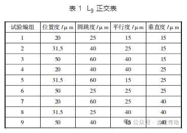 通過現有研究的數學模型不等式對變速箱箱體軸承孔的公差進行約束,并利用正交試驗法對軸承孔的特征公差進行定值,并區分為 9 組試驗組,主要考慮的公差因素有 4 個(位置度、圓跳度、平行度以及垂直度),本文采用 L9(34 )正交表進行試驗。