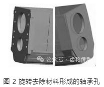 在 Creo 中根據上述表格對箱體軸承孔進行幾何建模,為了確保能夠建立合適的幾何誤差模型,需要對軸承孔進行參數化建模,先建立箱體其他部分的特征模型,然后再箱體的對稱中心建立草圖,中性線使用箱體內壁上的兩點確定,然后繪制以軸承孔半徑長為寬、內壁距離長為長的長方形,并使用旋轉命令去除箱體材料,形成軸承孔,如圖 2 所示。
