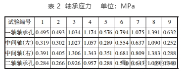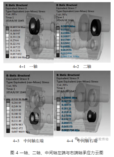 基于表 1 公差試驗組進行 ANSYS 求解計算,求解完成后得到試驗結果,以第一試驗組為例進行分析,此時的位置度為 20 μm、圓跳度為 25 μm、平行度為 15 μm、垂直度為 15 μm,觀察此時的一軸、二軸、中間軸左端與右端的軸承應力云圖,如圖 4 所示。