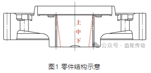 變速器7T800機型是某世界汽車巨頭全球新車型的傳動系統,其一擋齒輪結構設計為內花鍵,與中間軸外花鍵通過壓裝相配連接。該零件的內花鍵較長,內孔壁厚變化較大,熱處理(滲碳淬火)時內孔徑向變形不一致,導致內花鍵上中下三段M值不同,呈現軸向錐度,如圖1所示。該熱處理變形導致的不合格率約為10%,對產品質量和交付造成了較大影響。