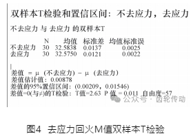 (1)焊接應力 該零件為齒輪齒圈焊接結構,考慮焊接產生較大的應力可能引起內花鍵變形大,采用200℃回火2h的方案進行驗證。取去應力回火(200℃×2h)和正常生產的零件各30件,測量M值進行雙樣本T分析。H0:熱處理前回火去應力對M值沒有顯著影響;H1:熱處理前回火去應力對M值有顯著影響。分析結果如圖4所示,P值<0.05,拒絕H0,去應力和不去應力的一擋內花鍵內花鍵M值存在明顯差異。據此,零件焊接探傷后增加去應力回火工序。