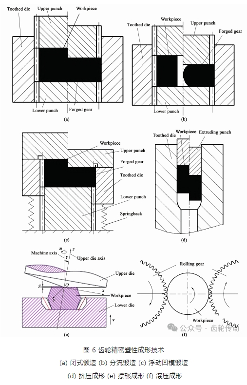 齒輪精密塑性成形技術按照成形溫度不同可以分為熱精鍛、冷精鍛、溫精鍛和復合精鍛等。根據不同類型齒輪齒形結構特點的不同, 國內外眾多學者從模具結構設計方面針對各種類型的齒輪進行了大量的研究, 開發了多種齒輪精密塑性成形技術, 主要有閉式鍛造、分流鍛造、浮動凹模鍛造、擠壓成形、擺輾成形、滾壓成形以及各種成形技術組合的復合成形技術等, 如圖 6 所示。