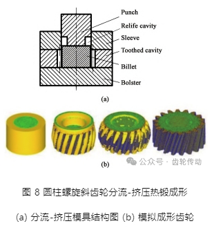由于圓柱直齒輪、圓柱螺旋/ 斜齒輪齒形在圓柱面上, 且在鍛造中金屬材料的塑性流動方向垂直于其受力方向, 因此其齒形比錐齒輪更難形成, 而且閉式鍛造成形的最后階段存在成形力急劇增大、角隅難以充滿及模具壽命低等問題, 尤其是圓柱螺旋/ 斜齒輪齒形呈螺旋形狀, 材料流動更復雜, 因此圓柱直齒輪、圓柱螺旋/ 斜齒輪熱精鍛成形的應用還存在較大困難。為了降低圓柱齒輪閉式模鍛最后階段成形載荷、改善金屬材料流動, 國內外許多學者將分流減壓工藝和閉式鍛造工藝相結合的分流鍛造技術用于成形圓柱直齒輪、圓柱螺旋/ 斜齒輪, 即在坯料或者凸模上開設分流孔, 在分流鍛造成形過程中, 坯料在充滿模膛的同時, 部分坯料流向分流孔, 從而來改善材料的流動、降低成形載荷。圖 8 所示為武漢理工大學設計的帶凸臺的凸模結構在熱鍛成形時與坯料形成分流空腔的圓柱螺旋/ 斜齒輪分流- 擠壓熱鍛成形工藝圖。馮瑋等和秦飛研究了不同尺寸分流空腔對成形載荷、等效應變分布的影響, 結果表明: 合理的分流腔設計可以有效減小成形載荷, 改善等效應變分布的均勻性, 進一步通過建立變形-傳熱-微觀組織耦合有限元模型, 揭示了圓柱螺旋/ 斜齒輪分流-擠壓宏微觀變形規律和耦合影響規律。