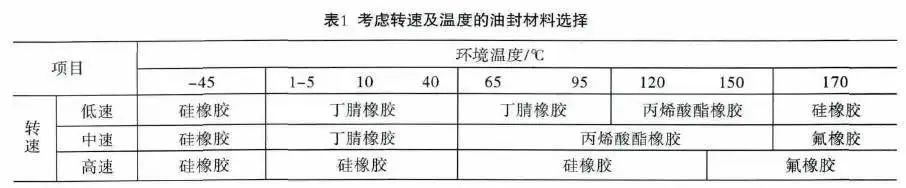 在選擇油封時應綜合考慮其工作條件及經濟性以便選擇合適的材料。對于輥壓機高速軸而言,由于其轉速達到1440r/min,在油封唇口與軸的表面摩擦產生大量的熱量,接觸面會產生很高的溫度(超過120℃)。實測密封端蓋的表面溫度達到65℃左右,內部溫度則更高,所以一般的油封不滿足這樣的工作條件,必須選擇性能優良的油封材料。考慮轉速及溫度的油封材料選擇如表1所示: