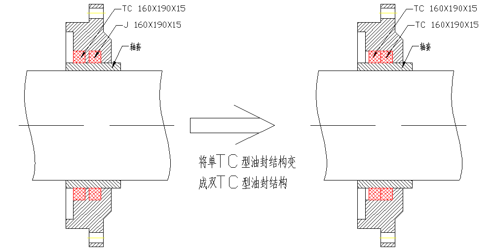 從減少設備的故障率考慮,保證高速軸密封長期工作不漏油,建議將輥壓機高速軸密封改為雙TC型密封,將原來的J型密封件換成TC型密封件。由于原來安裝兩個油封的槽內徑尺寸相同,中間只是多了一個凸臺將兩個油封分開,我們只需要將凸臺用車床車掉即可。
