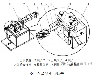 齒輪夾持裝置:夾持裝置是檢測(cè)臺(tái)重要的組成部分,采用三端夾緊可調(diào)節(jié)形式,方便線齒輪的快速裝夾,以適應(yīng)不同參數(shù)線齒輪的檢測(cè)。圖 10 所示滾子一、滾子二與上頂滾子夾住齒輪夾持棒,被測(cè)線齒輪裝夾在齒輪夾持棒上,滾子由伺服電機(jī)驅(qū)動(dòng),滾子與齒輪夾持棒之間的傳動(dòng)通過(guò)摩擦力實(shí)現(xiàn),該夾持的優(yōu)點(diǎn)是具有自保護(hù)功能,在不發(fā)生相對(duì)滑動(dòng)的情況下可以進(jìn)行齒輪檢測(cè),當(dāng)檢測(cè)傳感器與被測(cè)齒輪發(fā)生意外干涉,齒輪夾持棒與兩滾子之間發(fā)生相對(duì)滑動(dòng),可以保護(hù)伺服電機(jī)和檢測(cè)傳感器不受損壞,提高檢測(cè)臺(tái)的使用容錯(cuò)率,符合柔性設(shè)計(jì)。