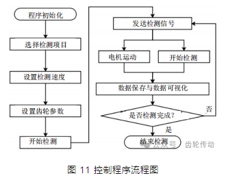 檢測(cè)臺(tái)的控制系統(tǒng)主要包括上位機(jī),控制卡和控制器。上位機(jī)將檢測(cè)命令發(fā)送到控制卡,控制卡將信號(hào)發(fā)送給電機(jī)驅(qū)動(dòng)器,由驅(qū)動(dòng)器帶動(dòng)伺服電機(jī)轉(zhuǎn)動(dòng),實(shí)現(xiàn)檢測(cè)的運(yùn)動(dòng)控制。控制卡集成了數(shù)據(jù)采集模塊,上位機(jī)讀取控制卡所采集的點(diǎn)云數(shù)據(jù)并保存在到本地磁盤(pán)。所有數(shù)據(jù)同步采集,采集信號(hào)由上位機(jī)發(fā)出。控制程序在上位機(jī)中運(yùn)行,使用坐標(biāo)插補(bǔ)的形式控制檢測(cè)傳感器與被測(cè)線齒輪的相對(duì)位置。控制程序流程圖如圖 11 所示。程序采用 C++編寫(xiě)。