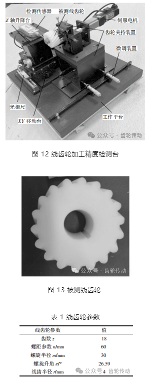 基于以上設(shè)計(jì)制造的線齒輪加工精度檢測(cè)臺(tái)如圖 12 所示,使用專(zhuān)用數(shù)控銑床加工的線齒輪進(jìn)行檢測(cè)實(shí)驗(yàn),如圖 13 所示,其材料為聚甲醛,線齒輪參數(shù)如表 1 所示。