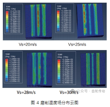 圖4 顯示了不同砂輪線速度下的齒面溫度分布云圖(磨削深度 ap=0.01mm)。