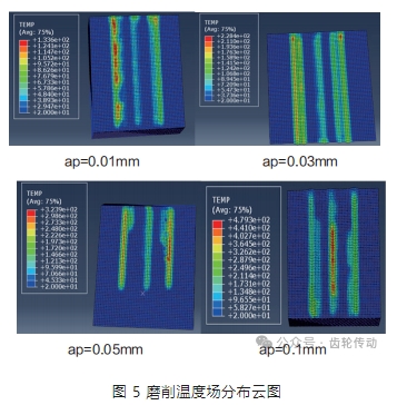 圖 5 顯示了不同磨削深度下的齒面溫度分布云圖(砂輪線速度 Vs=25m/s)。