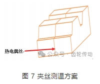 ①采用圖 7 所示的夾絲測溫方法,將熱電偶絲貼在齒根處,利用溫度測量表測量該處的溫度,記錄每組試驗的瞬時最高溫度。