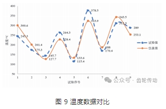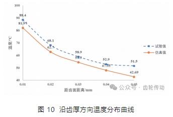 從圖 10 可以看到,試驗數據與仿真數據在沿齒厚方向的變化趨勢是相同的,試驗數據略大于仿真數據,最大偏差為 9℃,在可接受范圍內。