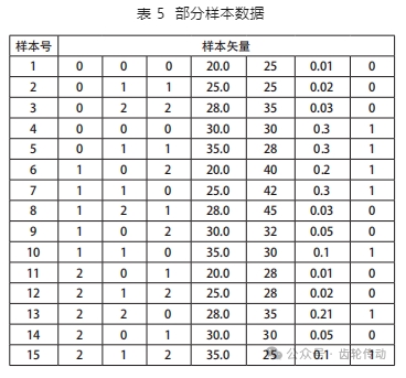 如樣本矢量 [0,2,2,35.0,30.0,0.05,1] 表示工件材料為 20Cr,砂輪材料 WA,水基切削液,砂輪線速度 35m/s,進給速度 30mm/s, 磨削深度 0.05mm,發生了磨削燒傷。