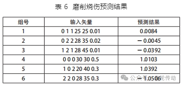 將表 6 的 4-6 組樣本數據輸入到模型中,輸出矢量為 1.0103、1.0392、-1.0506,顯示發生了燒傷。表 5 發生磨削燒傷的第 4、6、13 號樣本,其磨削深度值小于表 6 中 的第 4、5、6 號樣本,因此表 6 中的第 4、5、6 號樣本也必然發生磨削燒傷,說明神經網絡的預測結果是合理的。