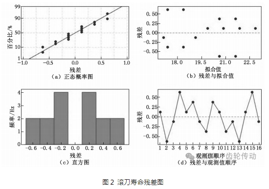 分析完主要因子和次要因子后,還需對(duì)殘差狀況進(jìn)行診斷,以此來判斷分析模型是否合適,圖2為滾刀壽命殘差圖。圖2(a)顯示各點(diǎn)近似在一條直線;圖2(c)中矩形左右對(duì)稱,可認(rèn)為該實(shí)驗(yàn)設(shè)計(jì)的殘差近似服從正態(tài)分布;圖2(b)和圖2(d)顯示該實(shí)驗(yàn)設(shè)計(jì)的殘差基本符合隨機(jī)波動(dòng)。從殘差圖的分析來看,本次實(shí)驗(yàn)?zāi)P突緷M足要求。