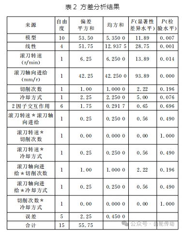 方差分析能夠直觀地根據(jù)結(jié)果來推斷哪些因子對(duì)結(jié)果有明顯的影響以及影響有多大,表2為方差分析結(jié)果。通過表2結(jié)果中的檢驗(yàn)水平P 值大小來判斷因子是否顯著,P 值小于0.05為顯著因子,而滾刀軸向進(jìn)給和滾刀轉(zhuǎn)速的P 值小于0.05,因此為顯著影響因子。