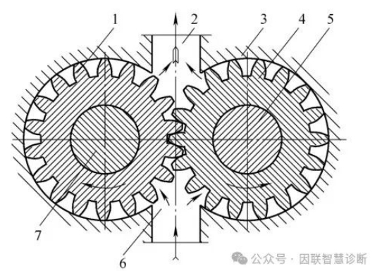 1—主動齒輪;2一排出口;3—泵殼;4—從動齒輪;5—從動軸;6—吸入口;7—主動軸