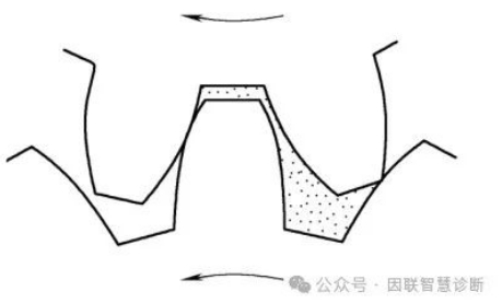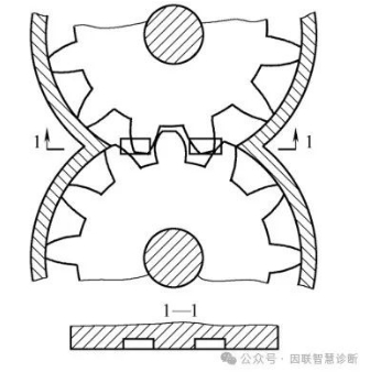 泵工作過程中,在排出口擠出液體時,尚有少量液體被封閉在互相嚙合的兩齒齒穴中,形成了一個封閉空間(圖3)。封閉空間從大變小,齒穴中的液體被擠壓,產生較高的壓力,使泵軸上的徑向力增大。在吸入口處,封閉空間由小變大,在瞬間產生了低壓,析出了油蒸氣,析出的油蒸氣在冷凝時,會產生一種類似汽蝕現象的沖蝕作用,使輪齒的光滑表面受到剝蝕。