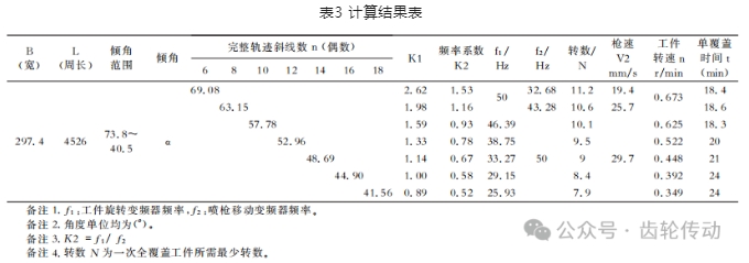 例:齒圈周長 L=4526mm,B=297.4mm,工件旋轉減速機電機P=4極,減速比i=2065,噴槍移動減速機電機P=4極,減速比i=731,鏈輪母線周長 L1=0.937m, 計算結果如表3所示: