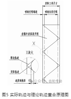 由于理論計算中使用理論折線軌跡,而實際情況下噴槍在往復行程終點速度方向進行轉換,在此過程中速度不為勻速所以實際軌跡線與理論軌跡線偏離,可通過調整噴槍往復行程,使實際軌跡與理論軌跡重合。調整原理如圖5所示: