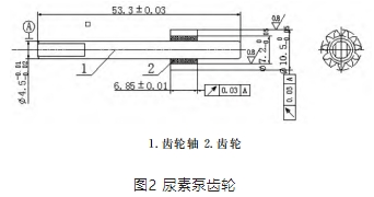 塑料齒輪制造工藝分為非切削加工和切削加工:(1) 非切削加工,如注塑、模壓成型等,適用于批量大、尺寸精度低的塑料齒輪;(2)切削加工,通常由塑料齒輪經(jīng)車削、銑削、插齒或滾齒等加工,達到尺寸精度和表面粗糙度要求,但效率較低。尿素泵齒輪如圖2所示,齒輪相對于軸的圓跳動為0.03、齒輪面的粗糙度為 Ra0.8,精度要求較高;為了滿足該塑料齒輪精度要求,本文結(jié)合非切削加工和切削加工的優(yōu)缺點,設(shè)計一套塑料齒輪精密切削夾具。