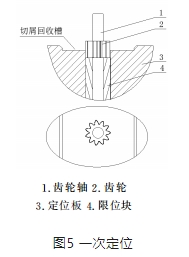 1、如圖5所示,定位板上和限位塊加工成齒輪狀,兩者間隙配合,齒輪軸一端先裝入限位塊的內(nèi)孔,一半齒輪則嵌入定位板的齒輪槽內(nèi);